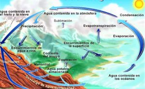 Este hace referencia a su transferencia de un lugar a otro, y para conseguirlo se manifiestas en sus tres estados: líquido, gaseoso y sólido. Es visible en nuestro planeta ya que se halla en estado líquido en mares, ríos, océanos y demás cuerpos de agua. En estado sólido se encuentra en glaciares y montañas. En el estado gaseoso se halla en las nubes. Su circulación es constante pues pasa por diversos procesos, gracias al calentamiento de los rayos solares que la evapora, condensa y llega a todo el ambiente.