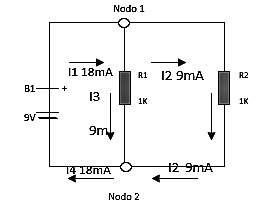 Por ende, es seguro que cada resistor va a tomar una corriente 9 mA de la batería o también que entre ambos van a tomar 18 mA de la batería. Se puede decir que de la batería parte un conductor en el que viaja 18mA que al pasar sobre el nodo este se divide, y sigue en diferentes direcciones en este caso hacia R1 y R2, los cuales vendrían siendo cada resistor, llevándole a cada uno 9mA pero cuando vuelven a retornar hacia la batería volverá con el mismo valor de 18 mA debido a que se vuelven a unir como se muestra a continuación.