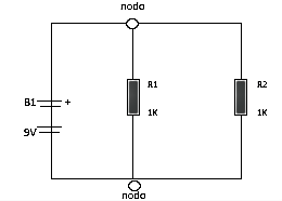 Si se analiza este circuito básico de corriente continua, podemos ver que hay dos resistores de 1khoms cada uno conectado a una misma batería y dos nodos. La batería se encuentra conservando su tensión fija, aunque estén conectados a él los dos resistores; esto da a entender que sobre cada resistor se le encuentra aplicada una tensión de 9 voltios.