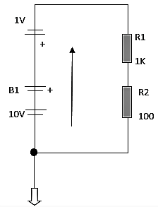 Estableciendo a la tierra como referencia, la batería asciende su potencial a 10 voltios mientras que la batería B2 baja a 1 voltio, por ende, la corriente que circula en total es 10-1= 9 voltios. Evaluando esto se establece que los electrones que atraviesan de B1 a R1 pero cuando pasa a B2 este pierde potencial y termina atravesando R2. La mejor manera de analizar esto es haciendo un esquema: